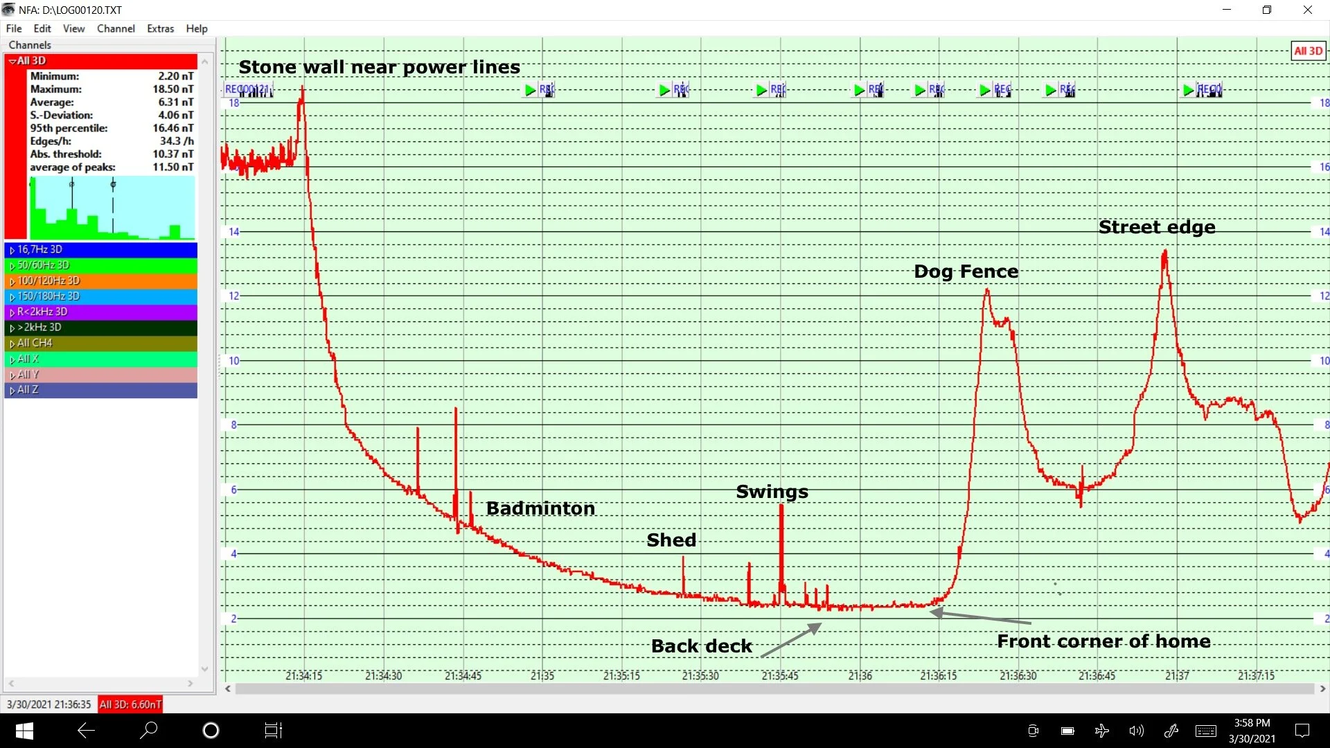 Above, is an AC Magnetic gaussmeter’s data log while walking from the rear edge of a property, closest to power lines (left-to-right), to the very front of the property near the street curb, and then over to an electrified dog fence and back down the driveway. The green background shows that this entire property was below 20 nT and therefore considered as “no concern” for AC magnetic radiation, according to the Building Biology, Bau Biologie, standards. ©2022 All rights are reserved.