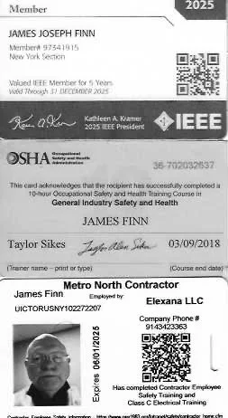 NYC street cred: Principal EMI Engineering Consultant, Voting Member of the IEEE New York Section, Voting Member of the IEEE EMC Society, Certified Professional Member of the NFPA® National Fire Protection Association, OSHA® Certified for General Industry, Voting Member of the European Bioelectromagnetics Society, Voting Member of the American Society of Photobiology, Member of the New York 212 Chamber of Commerce, Certified Building Biologist®, Certified Building Biology® Institute Professional Electromagnetic Radiation Specialist EMRS and Lifetime Member of the American Building Biology® Institute